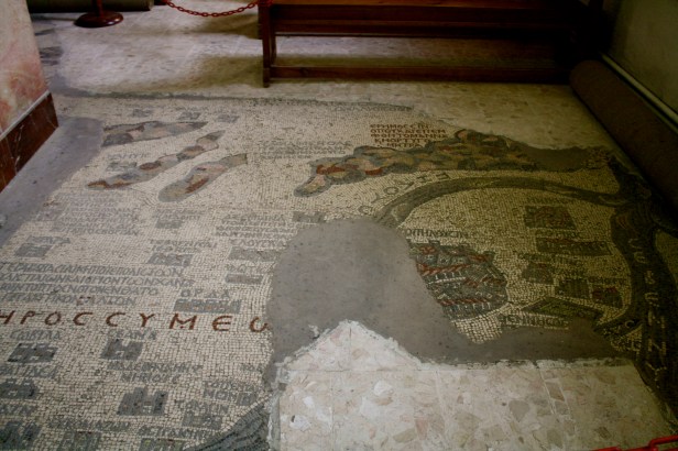 After settling in, we took a walk to the city of mosaics – Madaba. We visited St. George Church, an orthodox church, I believe. It is most famous for the mosaic map on the floor, which is supposed to depict the Holy Land. We definitely needed some help with identification. After that, we just kinda walked around Madaba a little, and checked out some of the architecture around town. We then proceeded to buy stuff for our dinner to take back to our hotel, and this included an excellent roast chicken, and some of the famous Jordanian sweets, for our little potluck dinner in our room. I love the small town of Madaba!