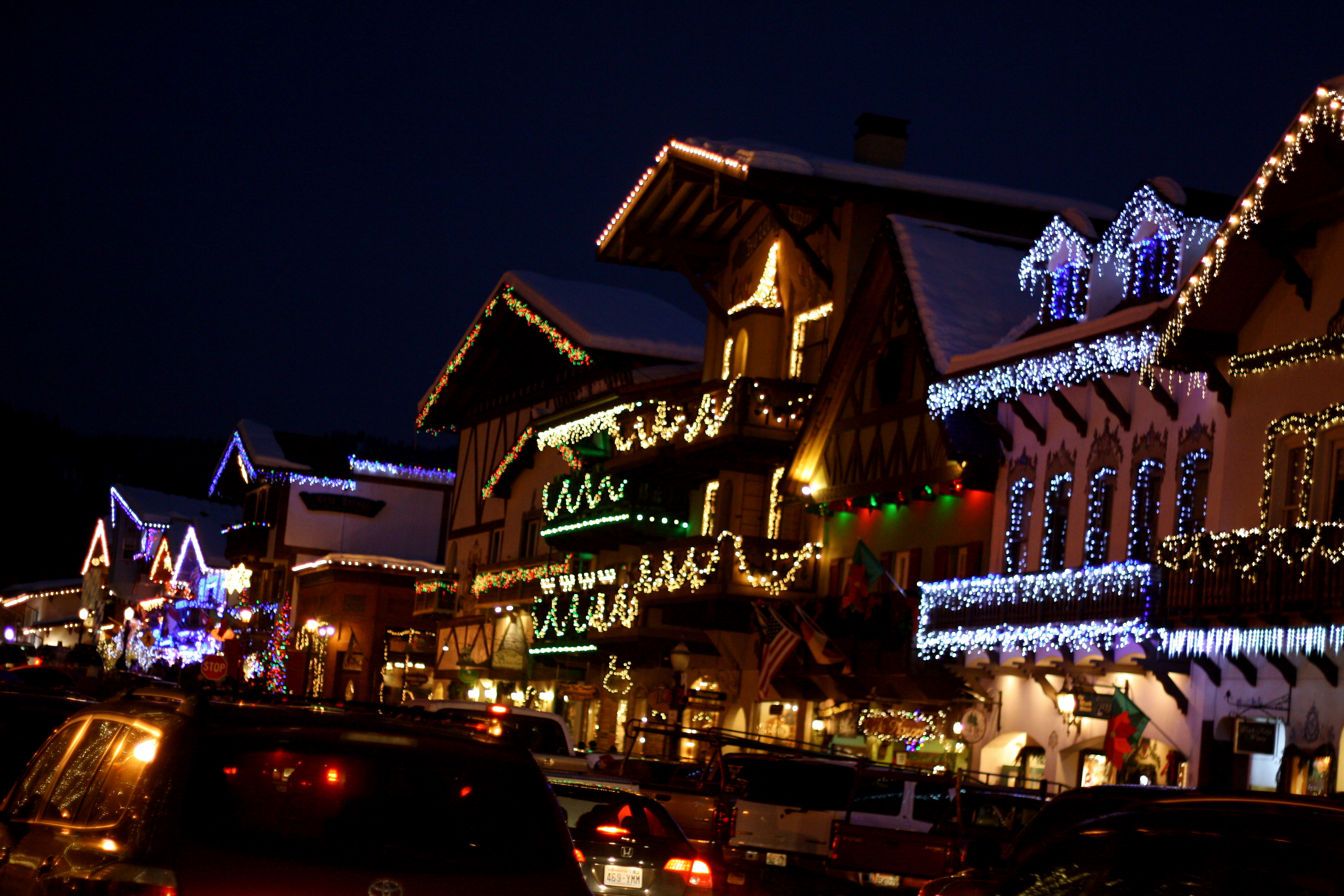 Leavenworth in the early evening lighted up for Christmas/New Year