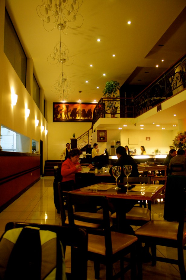 After settling in, we went hunting for dinner. B wanted to have something more Peruvian, and after consulting her guide, we ended up at Olimpico, which started in 1941, is one of the oldest restaurants in Huancayo, serves local delights, and is attached to Hotel Olimpico. We tried a papas a la huancaina, which is their version of potato gratin, topped with quail eggs. I had a trout done in a gratin for my entree. All in all, a very tasty and filling meal, and set us back by about 10 USD each. Do try it, it’s just beside the Plaza des Armas.